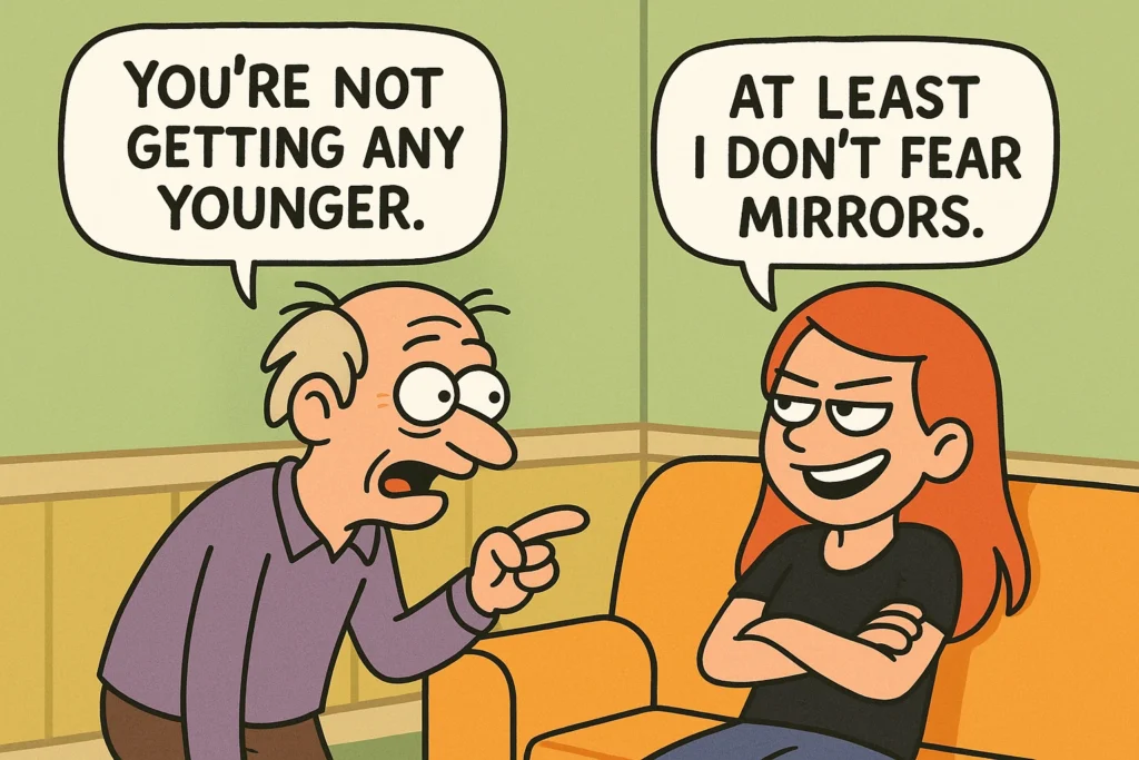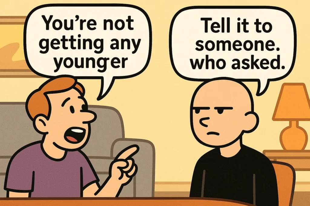 Ah yes, “You’re not getting any younger” — the polite way of saying, “Hurry up and panic.” Whether it’s from a well-meaning aunt at Thanksgiving or a coworker who peaked in 2009, that phrase has a special talent for showing up right when you didn’t ask for advice. It’s passive-aggressive. It’s unsolicited. And it’s begging for a clever comeback.